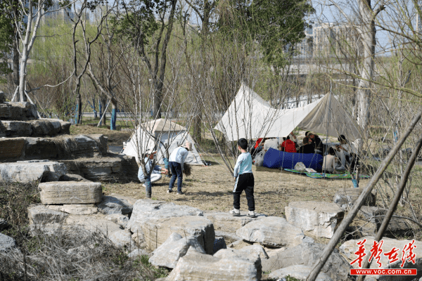 市民在磨盘洲生态公园露营(贺熙 摄)