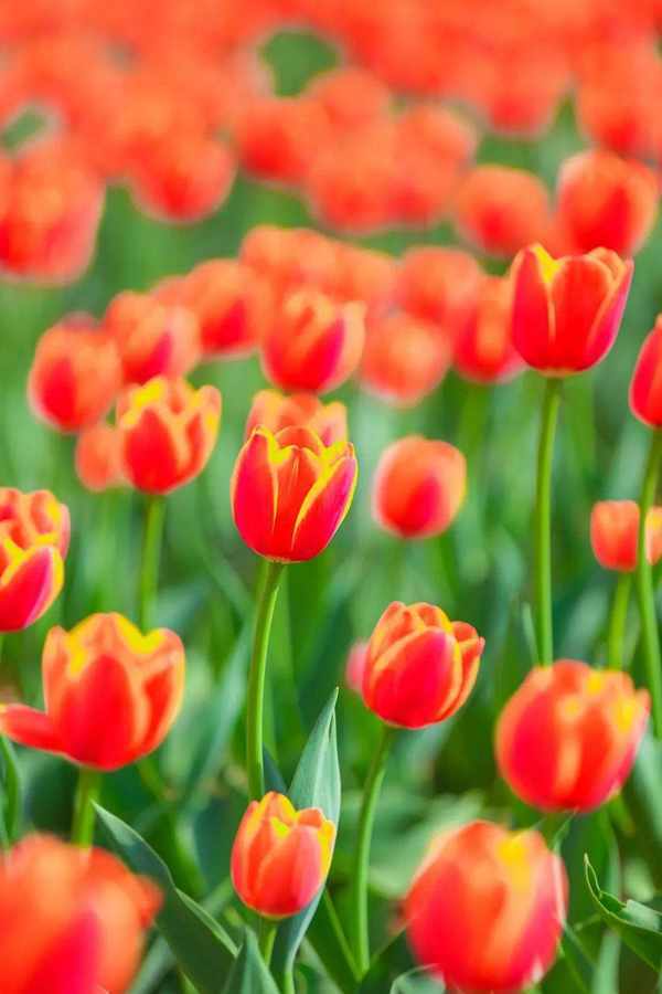 在海风的吹拂下,一朵朵娇艳欲滴、色彩斑斓的郁金香在风中轻盈舞动,五彩缤纷的花海,似乎要穷尽人间最美的颜色。