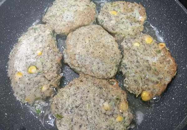 待调和完毕后,便将平底锅倒油烧热,然后用勺子乘出豆渣饼在锅中摊开抹匀,然后煎上一分钟即可翻一次面,等两面煎的焦黄时便可食用。