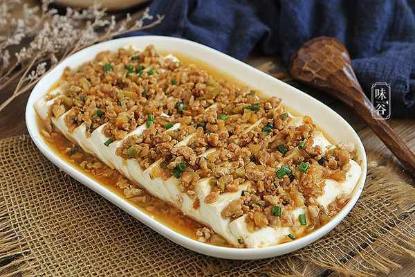 4、炒好的肉末榨菜铺在豆腐上,蒸锅坐水烧开,豆腐盘盖个盘子,上锅蒸10分钟,出锅时撒上葱花即可。