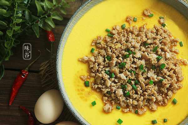 3、鸡蛋入锅蒸20分钟,蛋液凝固后把之前炒好的肉末铺在上面,再用余温焖3分钟即可。