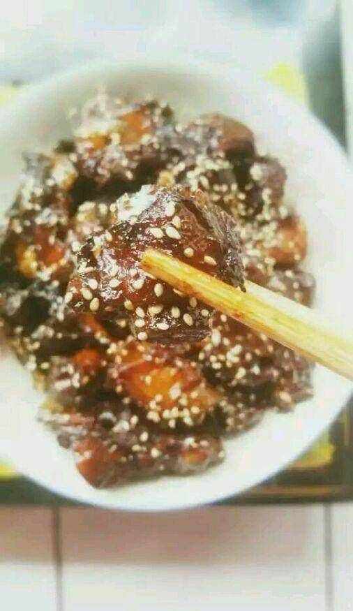 4待锅内汤汁粘稠时,下入。白糖。陈醋番茄酱小火熬制带收汁后起锅撒熟芝麻