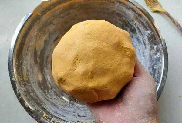 和面采用半烫面的做法,南瓜蒸好之后放入三分之一的糯米粉烫出黏性,然后放置温热的时候倒入剩下的糯米粉拌匀,这样做好的面团延伸线好,包馅不开裂。