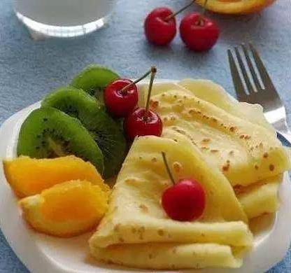 做法:1)将面粉过筛,以免面粉结块。2)将鸡蛋磕入碗中,搅打均匀。3)将黄油切小块,微波炉加热至融化,倒入蛋液中。4)加橙汁,搅匀。5)溶液倒入面粉中,沿着一个方向搅拌均匀。6)分次加入牛奶,一边加一边搅拌,直到牛奶与面粉溶合。7)平底锅刷一层油,舀入一勺面糊,小火加热到边缘开始微微翘起时。