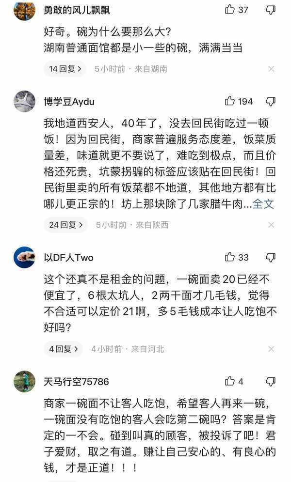 游客吐槽西安某面店20元/碗的分量太少,大大小小加一起只有6根面根本吃不饱,很多网友都有感而发,