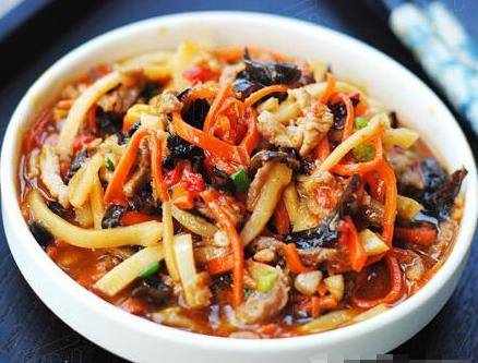 主料猪肉1块辅料冬笋半根黑木耳适量胡萝卜1根调料色拉油适量食盐4克醋适量葱5克姜5克蒜5克生抽5克淀粉适量白糖2克高汤适量剁椒小半碗