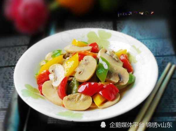 6、出锅装盘,一盘五彩缤纷又清淡适口的彩椒炒口蘑就做好啦!