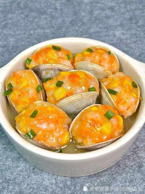 4、将虾滑塞入蛤蜊中,摆放在盘子上,水开上锅蒸十分钟左右。蒸熟之后,撒上葱花,放在一旁备用。