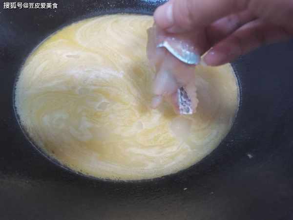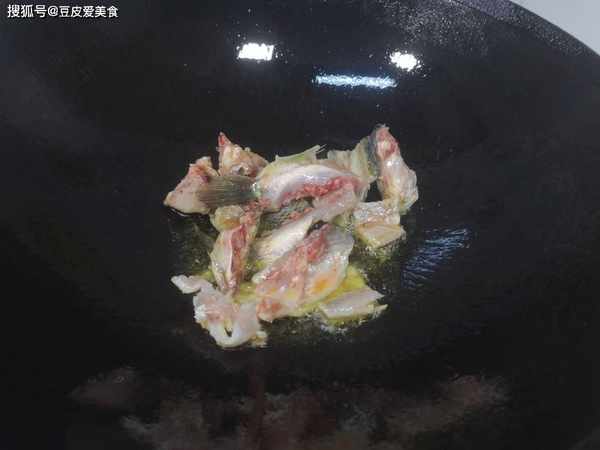 5、把锅烧热,等到锅很热后(很热鱼才不容易粘锅),下入油,热锅冷油下入生姜爆香,下入鱼头和鱼骨,煎至两面金黄,下入适量盐,黄灯笼辣椒酱,蒜和小米辣椒,翻炒出香味。