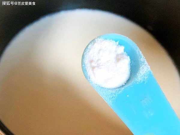 2、牛奶倒入锅里,煮至微沸。下入1克小苏打,迅速搅拌均匀。倒入醪糟,煮沸。