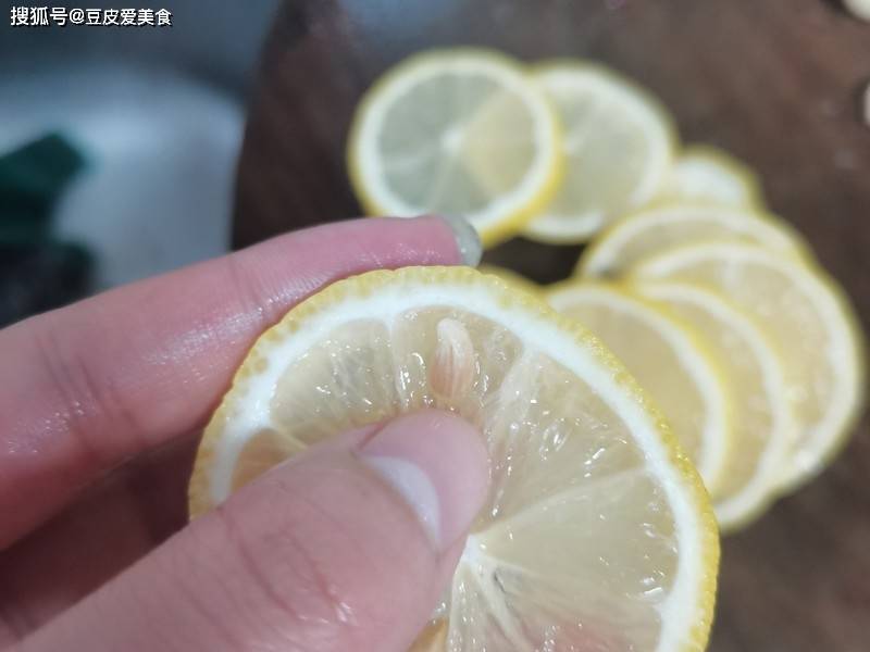 3、柠檬用盐抹在表面,再用手擦一擦,清洗干净,切成薄片,抠掉籽(籽会有苦味)。