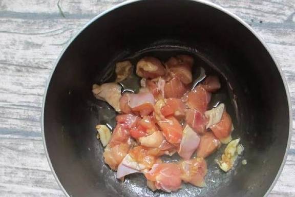 2、锅内放入1勺油,放入葱姜蒜沫、花椒爆香,放入鸡块翻炒