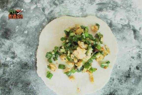 10、擀成面皮(包子皮一定要厚哦)把拌好的韭菜馅放在面皮中心