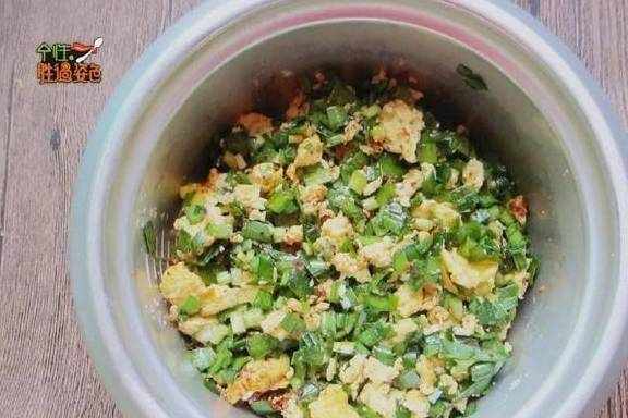 6、放凉的鸡蛋倒入韭菜中,加入适量盐、鸡精、香油、辣椒油