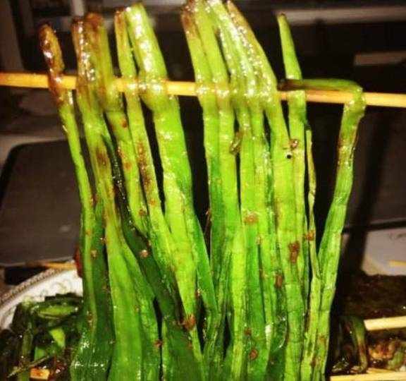 四、烤韭菜:可能很多人不喜欢吃韭菜,嫌弃韭菜的味道大或者嚼不烂等等。其实,烤韭菜也是非常好吃的,与平常炒韭菜的味道比较不一样,有兴趣的吃货可以试试。