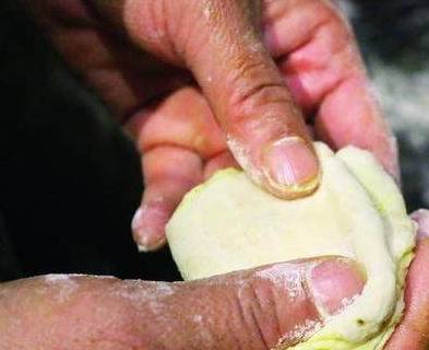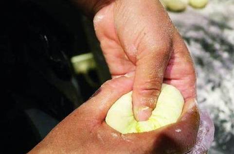 6、左手拇指向内按压,把收口藏入面中。