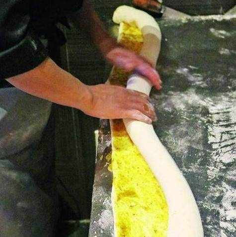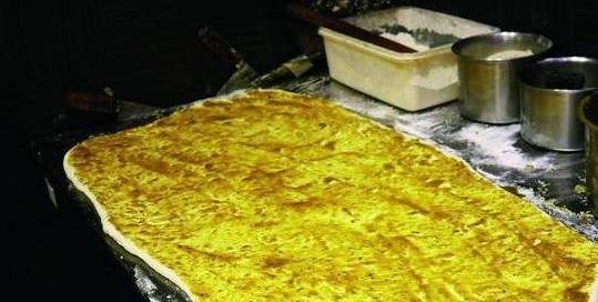 1、面粉2000克、清水1000克与老酵面500克,一同放入揉面机中揉成光滑的面团,取出置于案板,覆保鲜膜饧发1个小时,再擀成长约60厘米、宽约30厘米、厚约5毫米的大片,表面刷一层调好的苜蓿油酥。