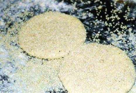 7、团成球状后收口朝下摆放,用擀面杖擀成小圆饼,表面刷色拉油,再粘上一层白芝麻粒。