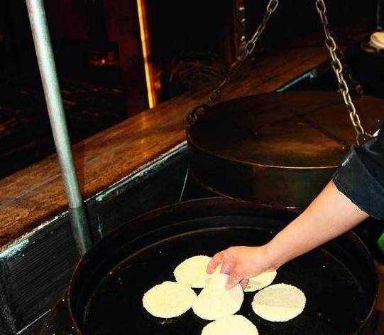 8、吊炉内的温度预热至300℃,然后把盖子移至一旁,将做好的烧饼生坯放入吊炉中,移回盖子烙10分钟。