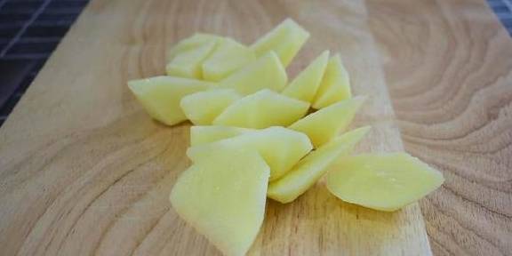 2、土豆去皮切滚刀块,大蒜切断,红椒切滚刀块备用;