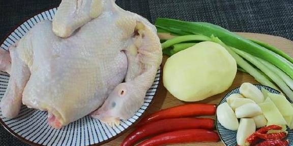 童子鸡1只,土豆1个,红椒3个,大蒜3颗,生姜少许,蒜粒少许,小米椒少许;