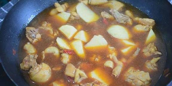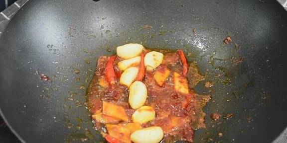3、放入土豆,盖上锅盖焖煮30分钟;
