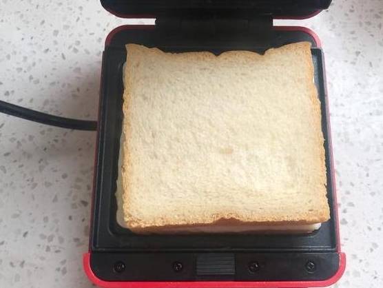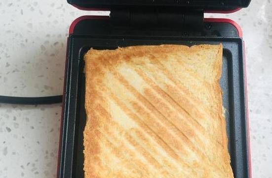 将准备好的三明治放在早餐机里面继续加热,加热三分钟左右的时间就可以了。要是没有早餐机的话,一样是可以使用平底锅来煎的,只要加入少量的植物油,等待吐司的两面煎到发黄就可以了。