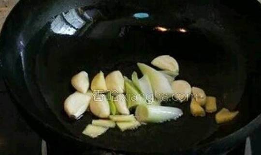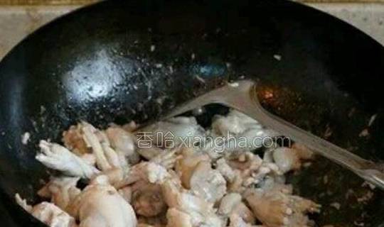 5.热锅下油,加牛蛙煸炒至断生,起锅备用。