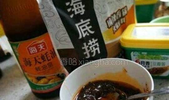 4.两勺麻辣锅底,一勺豆瓣酱,一勺蚝油,一勺盐,半勺糖,调匀。