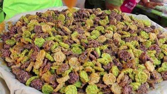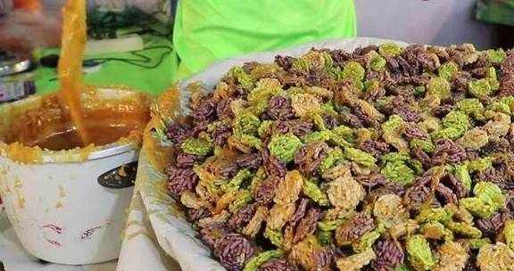 农村婆婆花20块买了一袋这小吃,闺蜜看见后,却花200块买了!婆婆在农村集市看见了这个小吃,就买了一袋给我们拿来,说非常好吃,刚放下,闺蜜就到家里来玩,尝了一块,觉得味道还不错,丢下200块钱就全部拿走了,说拿回家给孩子尝尝,你一定没吃过这个小吃,跟着婆婆来到小摊前,看到小摊前面有很大一个瓦缸,里面放有一些绿颜色的饭粒,然后有一个木头一直往瓦缸里面打。