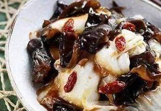 材料:白菜、木耳、枸杞子、油、盐、葱、姜、蒜、生抽、淀粉、白糖、黄酒