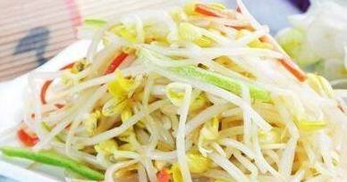材料:豆豆芽200克、干木耳1朵、胡萝卜20克、小黄瓜30克、辣椒1条、姜20克、盐1/4茶匙、糖1/2茶匙、白醋1/4茶匙