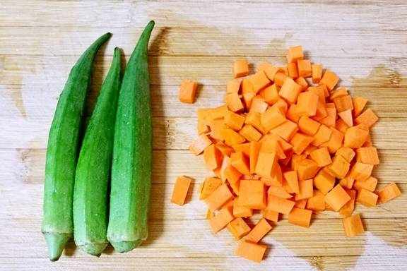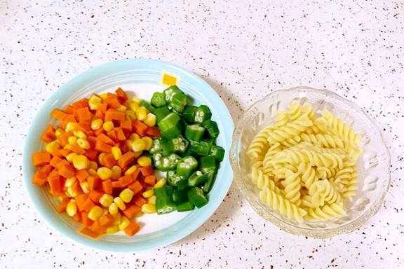 【所需配料】:秋葵、胡萝卜、螺丝意面