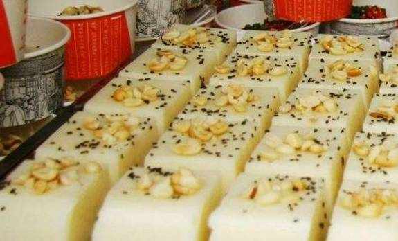 白白嫩嫩的凉粉在盘子上码好,上边撒上芝麻花生等干果,然后用蜂蜜和桂花调制成特制的甜酱,淋在凉粉上,看上去色泽诱人,口味极佳!