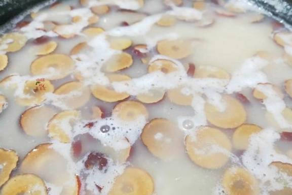 【第三步】:10分钟到后,开盖可以看到薏米已经被煮成很大一粒了,完全没有硬心,接下来把山药和红枣片倒入锅中,再继续煮8-10分钟左右,就可以关火了。