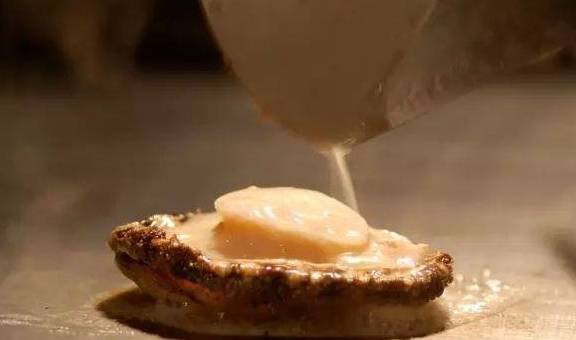 鲜活的鲍鱼在铁板上蠕动烧制,烧制过程中要加入黄油并与各种香草共同调配,烤制成后浇上酱汁。