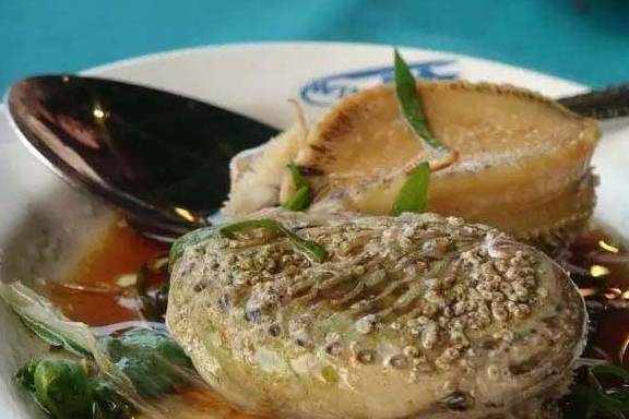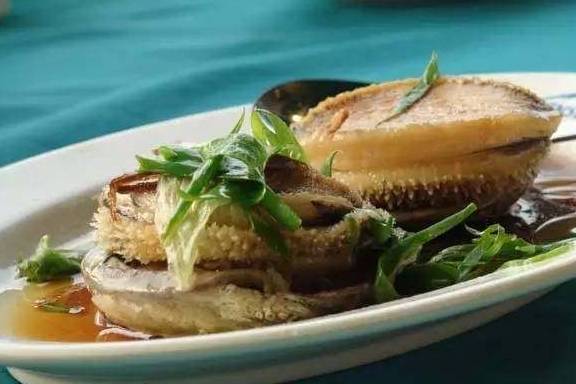 清蒸南非孔雀鲍,简单鲜美原味。由于孔雀鲍韧实,炆煮太久会变韧,只宜花汁煎,鲜美之馀又吃得出韧劲。南非鲜鲍隔水蒸后再淋上以鱼豉油及蚝油煮成的汁酱,鲜味十足,令人一食难忘。