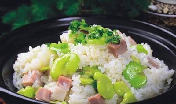 蚕豆焖饭的做法有两种,其一是选豆米大的蚕豆,剥去外面两层壳,只留最里面的豆米,拌着豌豆和腊肉炒熟一起焖饭,放了油盐的豆和米饭合在一起焖,吃起来不油腻,口感好,老人小孩食用无障碍,深受大众喜爱。