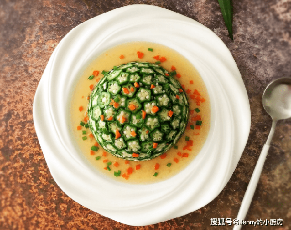 秋葵清洗干净,入锅煮两分钟,煮好后切成小块,放进小碗码好,堆放在碗壁上。