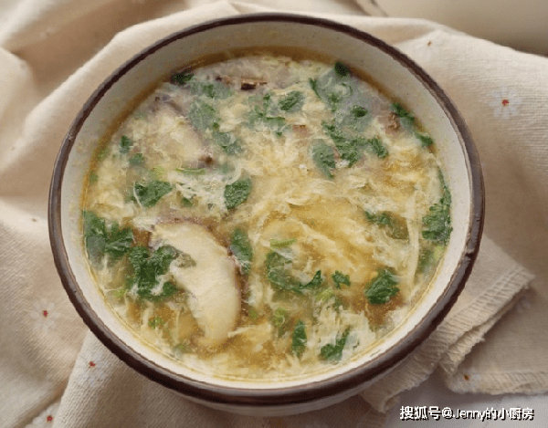 最后淋入蛋液,加盐调味,再倒入香菜搅拌均匀,就可以食用了。