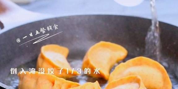 4.倒入的水要铺满锅底,淹没饺子1/3的水,盖盖中火焖至水干。大约6分钟吧,这时候饺子已经熟了。>>如果水煎好直接吃,不再有接下来的倒蛋液,倒入的水铺满锅底就可以了,水蒸干,也就是能听到滋滋拍拍的声音时关火,再焖3分钟就可以吃了。