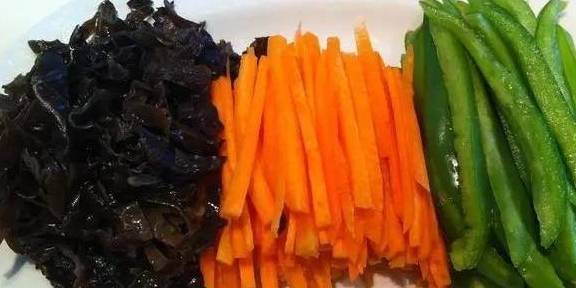 将干木耳,放入水里泡发开来,并切小块,胡萝卜去皮切丝,大蒜拍碎,大葱清洗干净切末,准备一个干净的空碗,加入适量的白糖,香,生抽,醋,耗油,凉开水,搅拌均匀