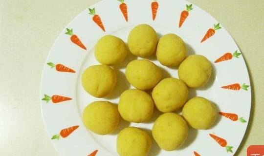 11.将红薯分等份搓成球,搓的时候手心抹点油不黏,正好十二个球