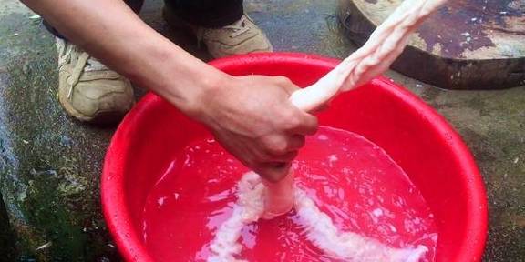 二、加入适量淀粉,盐、料酒反复搽洗几遍,然后用清水洗干净,直到不粘为好。