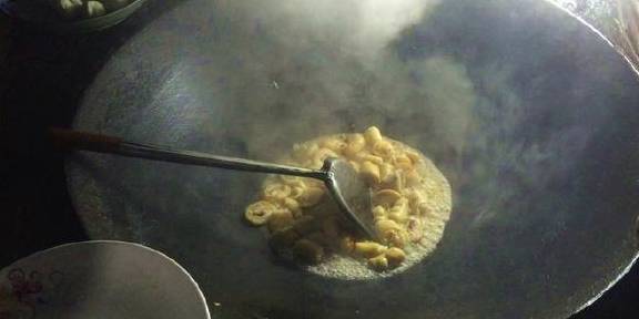 六、热锅下油,放入适量蒜蓉,辣椒炒香倒入肥肠,大火爆炒出油