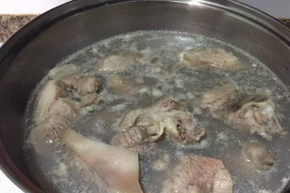 2、烧开水,把猪蹄焯水,水烧开后加入料酒继续煮2分钟,捞出洗净即可。