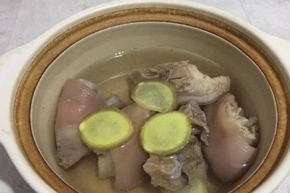 3、猪蹄放入砂锅中加入姜煲3小时。