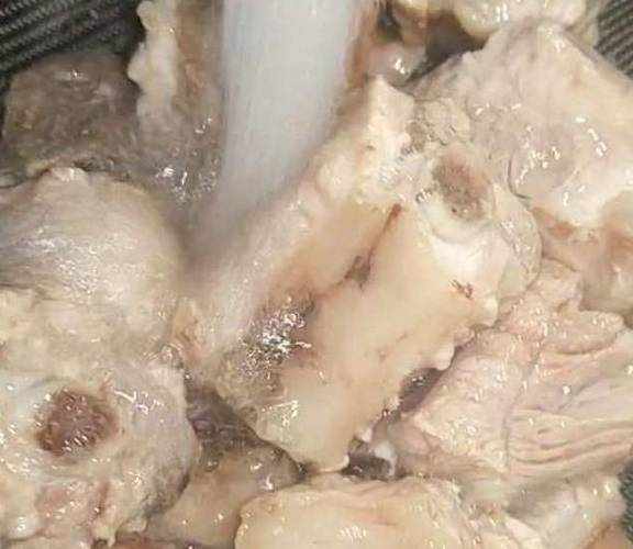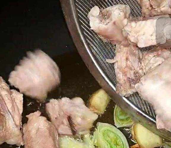 首先就是排骨买回来,一定要子排,然后砍成块,放到锅中加入水、料酒、葱姜大火煮开,煮出血末来。再用冷水冲洗干净并控掉水分。