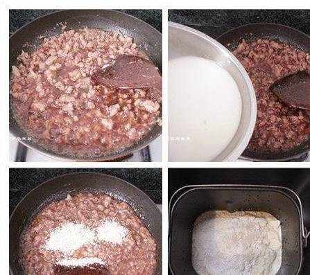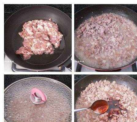 2.烧热平底锅,倒上适量食用油,倒入腌制好的馅料煸炒10分钟;炒至肉末发白;加上少许清水,遮上锅盖焖煮10分钟;打开锅盖,再调入3汤匙叉烧酱;