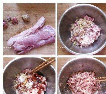 1.制作叉烧馅料:猪肉洗净沥干水、红葱头去皮去须,生姜去皮洗净;猪肉、葱头、生姜分别剁碎放入盆中;加入叉烧酱、鲍鱼汁、料酒、盐、鸡粉、蜜糖;用筷子往一个方向搅拌均匀,裹上保鲜膜,放入冰箱腌制保鲜半天;
